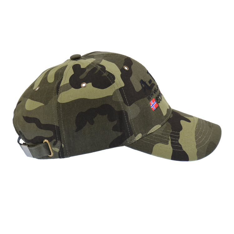 • Camo Green 100% Cotton. Nice hardy construction with reinforced front section to keep shape, buckle adjustment.