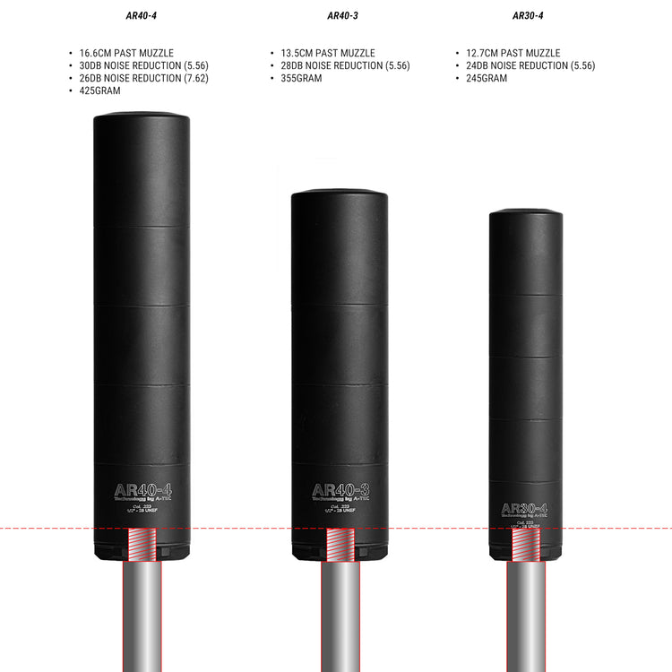 • Important note on reduction performance: Unique to A-Tec, our suppressors are tested to the latest MIL-STD-1474D military standard which is the most stringent and difficult standard to test to. Research shows our competitors do not test to this standard. For comparing to competitors products we prefer to let our reputation do the talking but you will observe our suppressors performing 5-10% better for a stated dB and significantly better for dB reduction vs. weight & length.