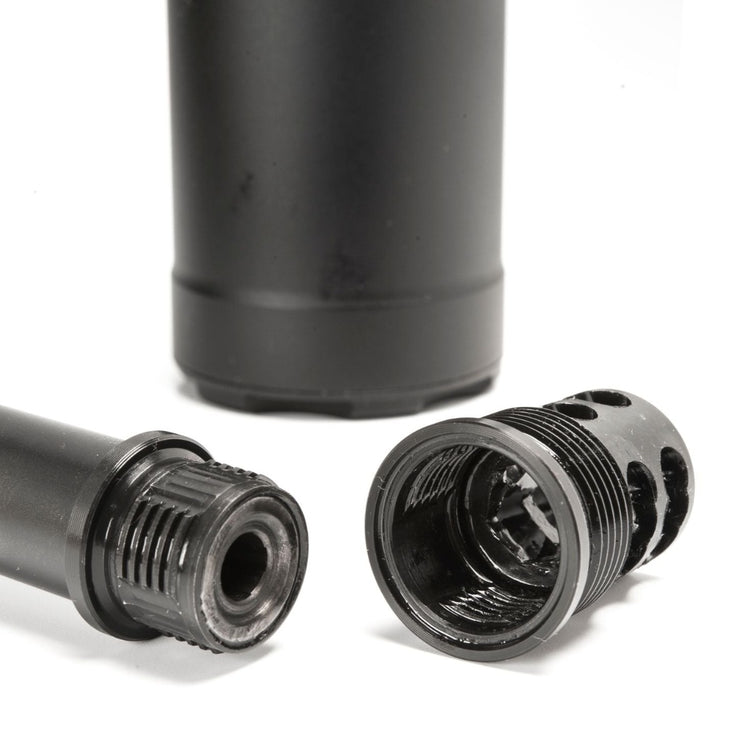- The suppressor features a built-in first stage stainless steel muzzle brake which traps gas for recoil reduction and eliminates excessive gas erosion of the alloy components.
