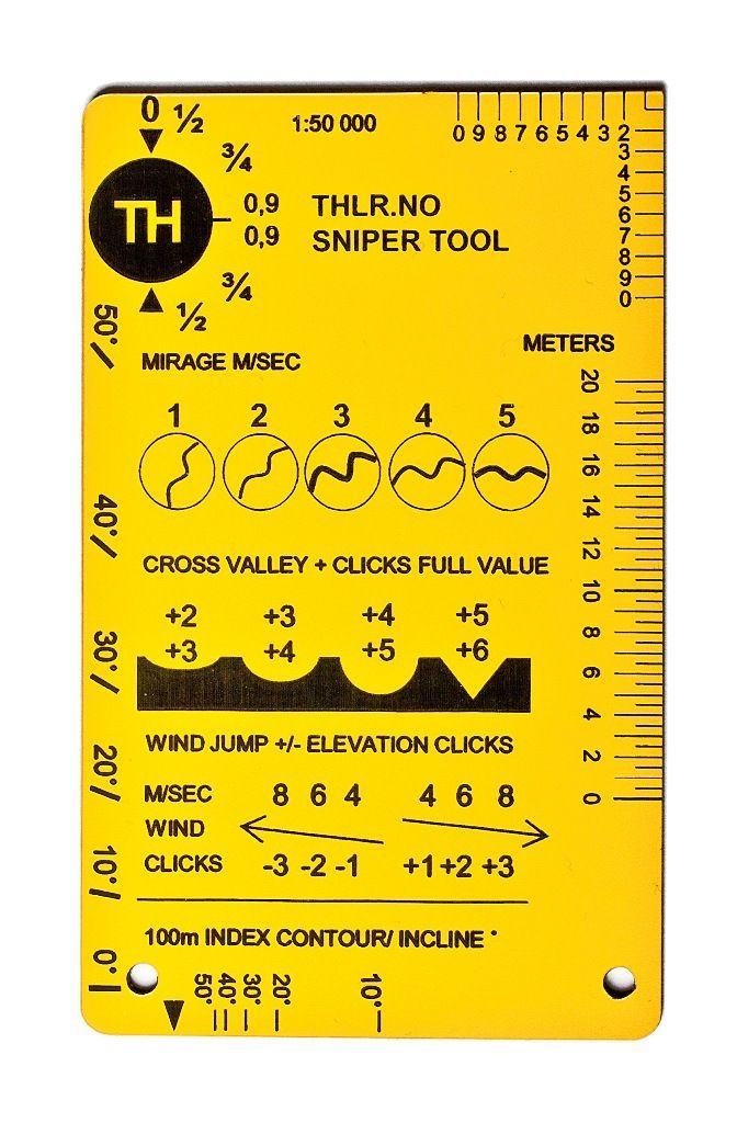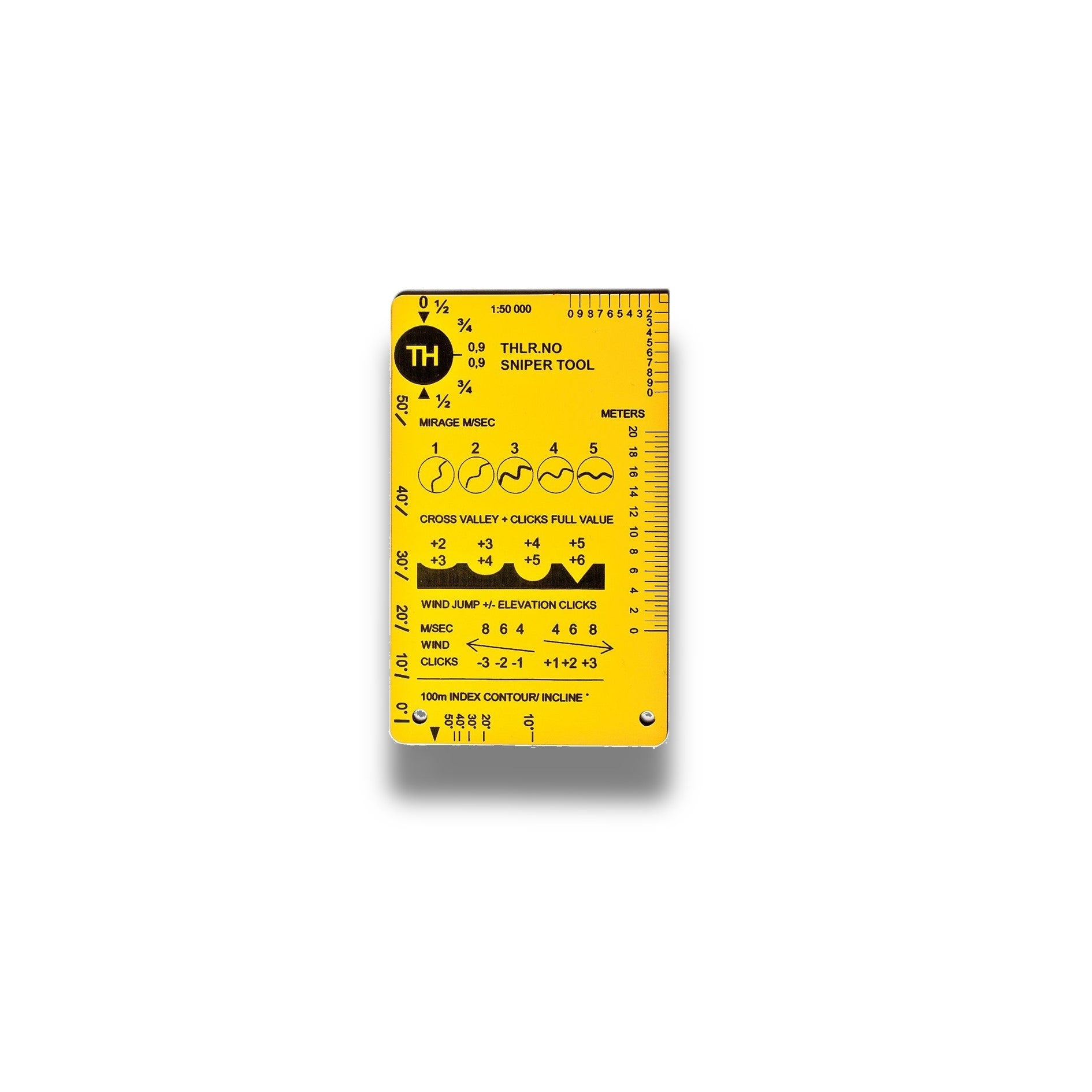 The THLR Sniper tool is engraved (not printed) on weatherproof, permanently coloured UV-proof laminated acrylic plastic. This quality is significantly stronger than what you find in ordinary credit cards. The card measures 90 x 56 x 1.6 mm. The THLR Sniper tool is available in yellow/black legend.