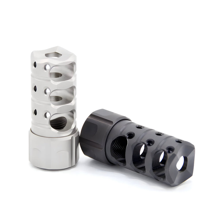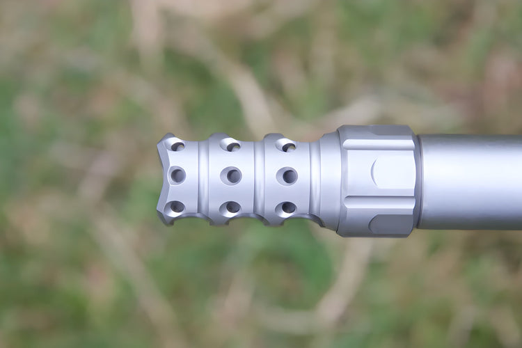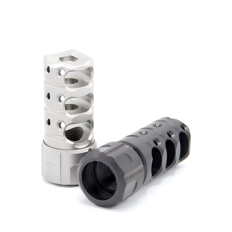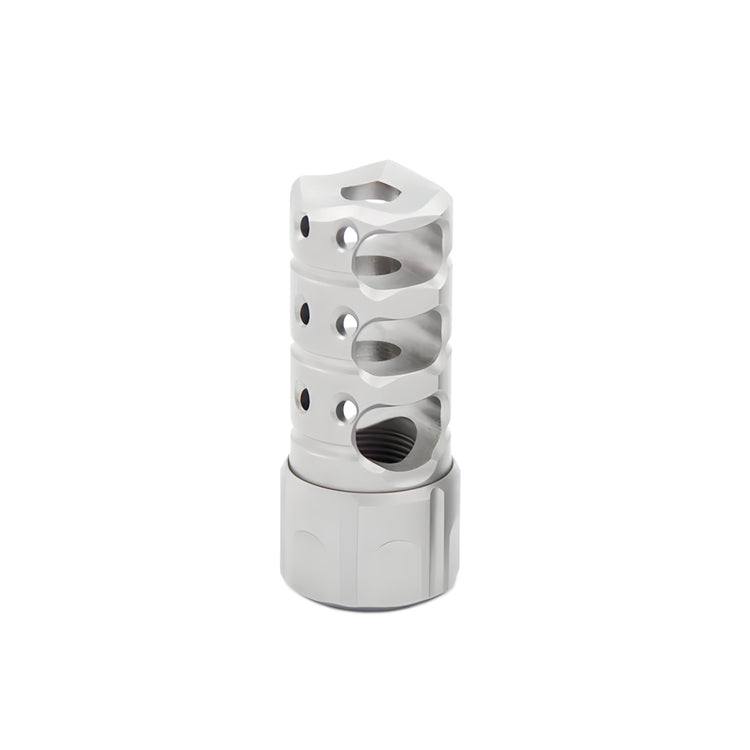 The unit includes horizontal main baffle ports to capture gas pressure and vastly reduce recoil. Along the top surface are tripple rows of ports providing down force to reduce muzzle flip and keep the target in the cross hairs during th recoil pulse.