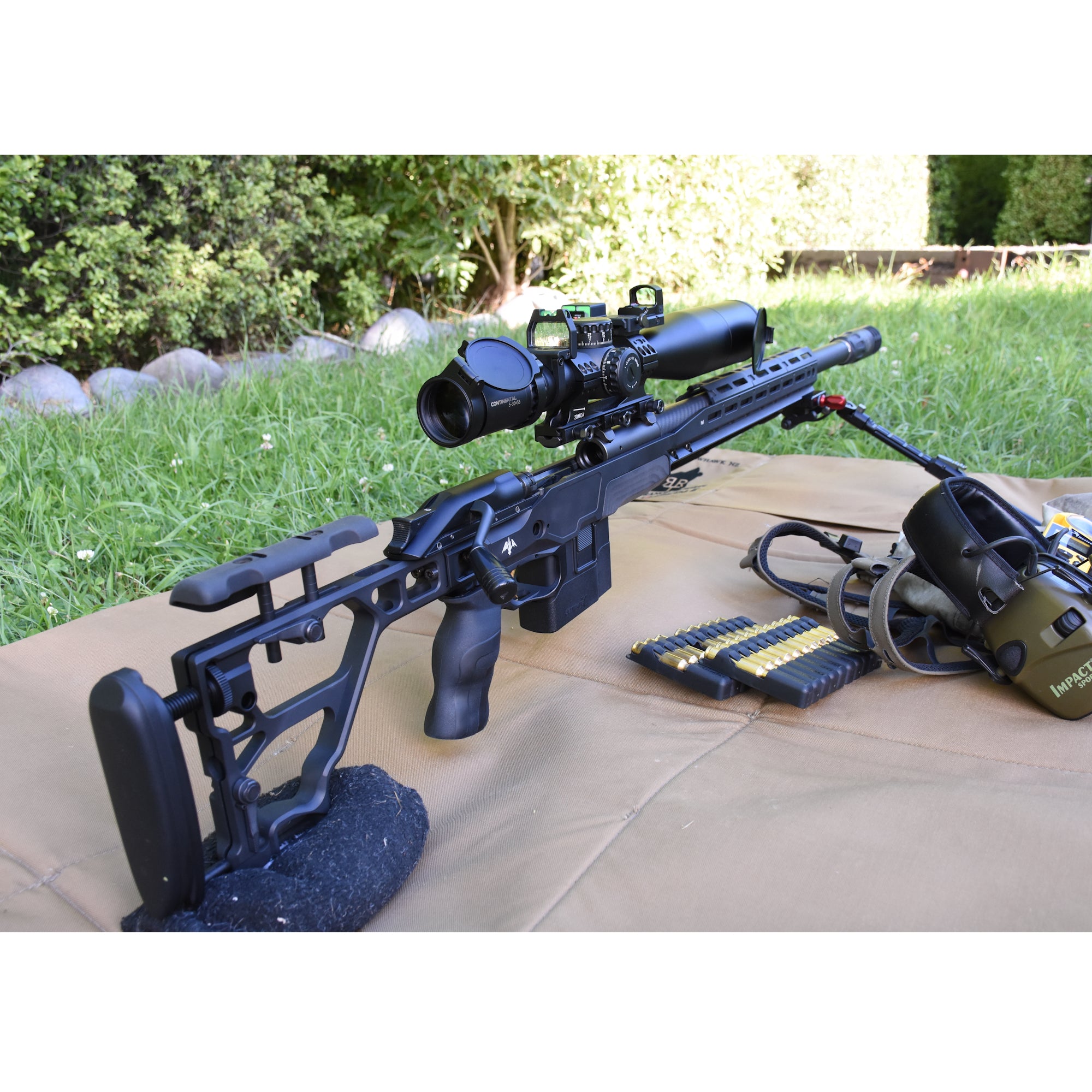 Optional additional side fold mechanism, to instantly reduce the length of the stowed rifle. The Side Fold unit replaces the spacer section shown and can be set up for right or left fold.